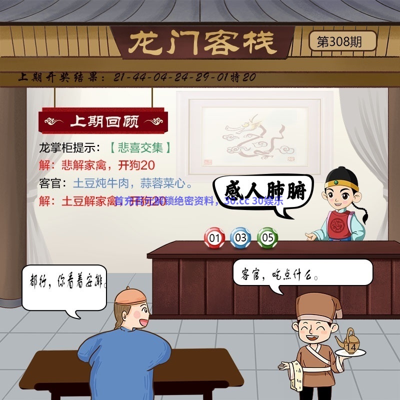第307期掌柜:悲喜交集 解:指悲伤与喜悦的情绪交织共存。 小二:客官,清上二楼包间。 解:无。 客官:土豆炖牛肉,蒜蓉菜心。 解:土豆解土肖的生肖牛、龙、羊、狗,菜心解菜肖的生肖猪、鼠、鸡、猴。 推荐九肖:虎蛇猴龙羊牛狗鼠马 |