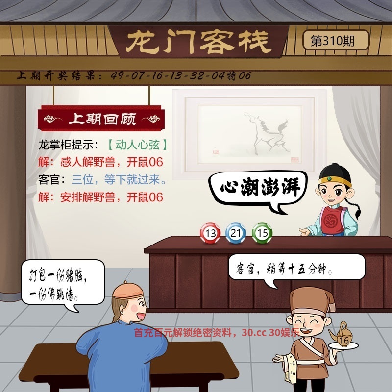 第310期掌柜:心潮澎湃 解:形象化表达内心如浪潮般剧烈翻涌的情感状态。 小二:客官,稍等十五分钟。 解:无。 客官:打包一份猪脑,一份佛跳墙。 解:佛跳墙解佛肖牛、蛇、马。 推荐九肖:牛虎狗龙马羊猪猴鸡 推荐六肖:牛虎狗龙马羊 推荐三肖:牛虎狗 |